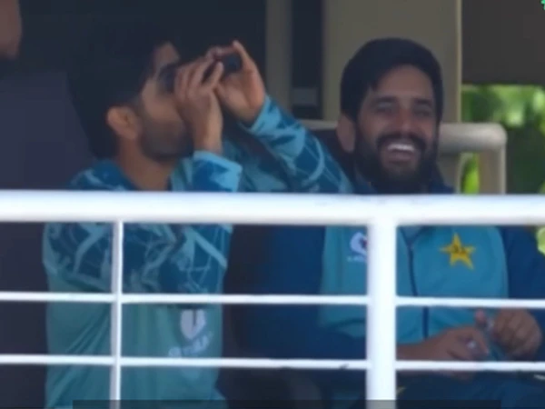 بابراعظم ڈریسنگ روم میں بیٹھ کر دوربین کی مدد سے کچھ دیکھنے کی کوشش کررہے تھے اس دوران اُن کے ساتھ بیٹھے ساتھی بھی ہنس پڑے۔